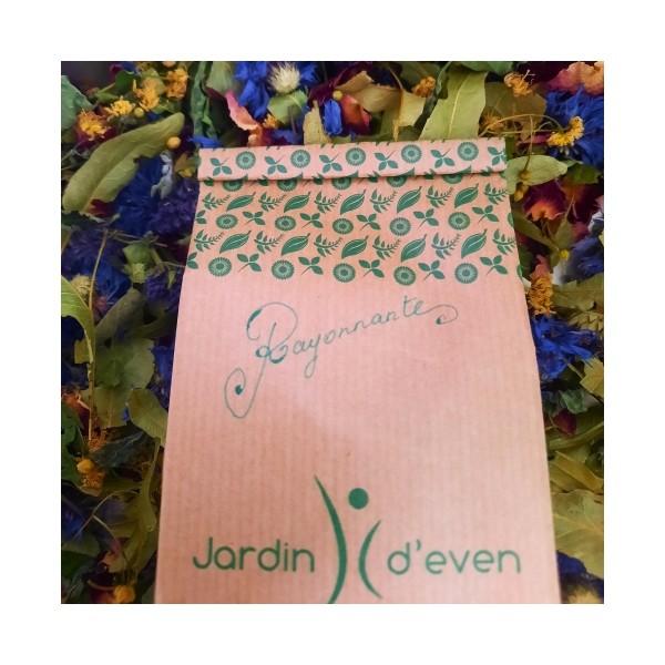 Rayonnante est un mélange rappelant les vitraux colorés, composé de Mauve, Bleuet, Achillée, Rose de Provins, Coudrier, Coquelicot, Marjolaine
